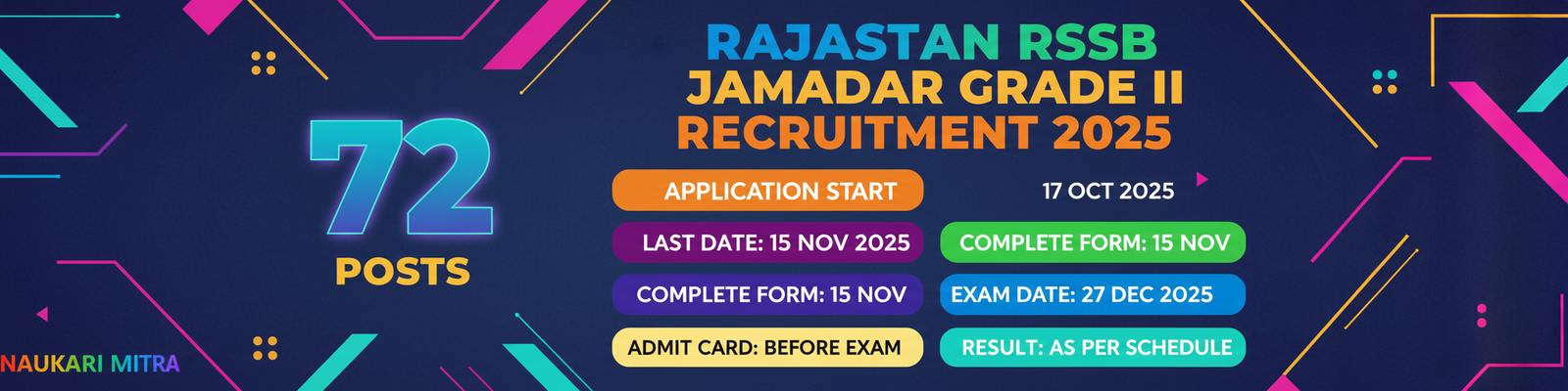 Rajasthan RSSB Jamadar Grade II Recruitment 2025 notification has been released for 72 vacancies. The Rajasthan Staff Selection Board (RSSB) invites eligible candidates to apply online for the Jamadar (Grade II) posts. The notification provides complete details including the application process, eligibility, syllabus, exam date, and salary information.